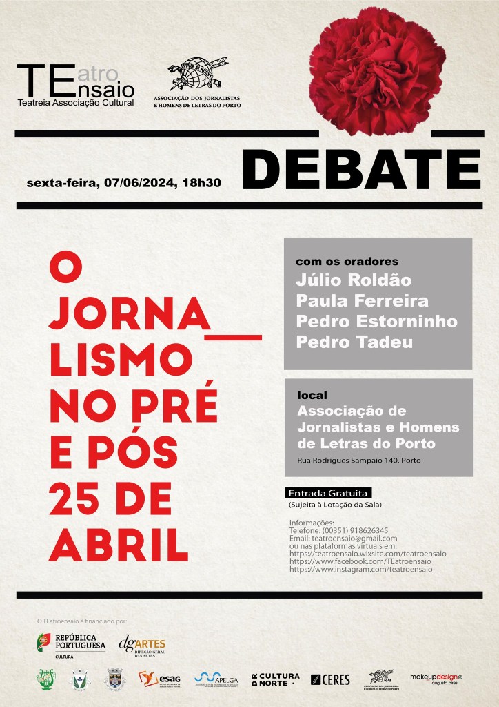 Sinopse: Comemorando os 50 anos do 25 de Abril de 1974, o TEatroensaio apresenta em coprodução com a Associação de Jornalistas e Homens de Letras do Porto, um Ciclo de Debates durante todo o ano de 2024. Este ciclo pretende contribuir para a comunicação livre e a divulgação da História e Cultura portuguesas, apresentando e discutindo o papel do Teatro, da Literatura e do Jornalismo na construção da Democracia, antes ou após a revolução de 1974. Deste modo fazemos caminho na Defesa da Liberdade de Expressão, exercício nunca terminado e sempre necessário.