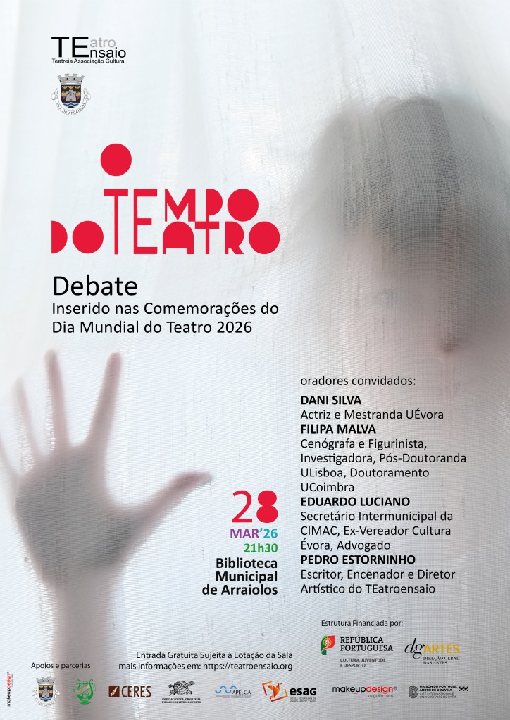 Oradores convidados: Dani Silva (actriz e mestranda da Uni. Évora); Filipa Malva (cenógrafa e figurinista, pós doutoranda na Uni. Lisboa, doutoramento Uni. Coimbra); Eduardo Luciano (secretário intermunicipal da CIMAC, ex-vereador da cultura da CM Évora e advogado); Pedro Estorninho (escritor, encenador e director artístico do TEatroensaio).
